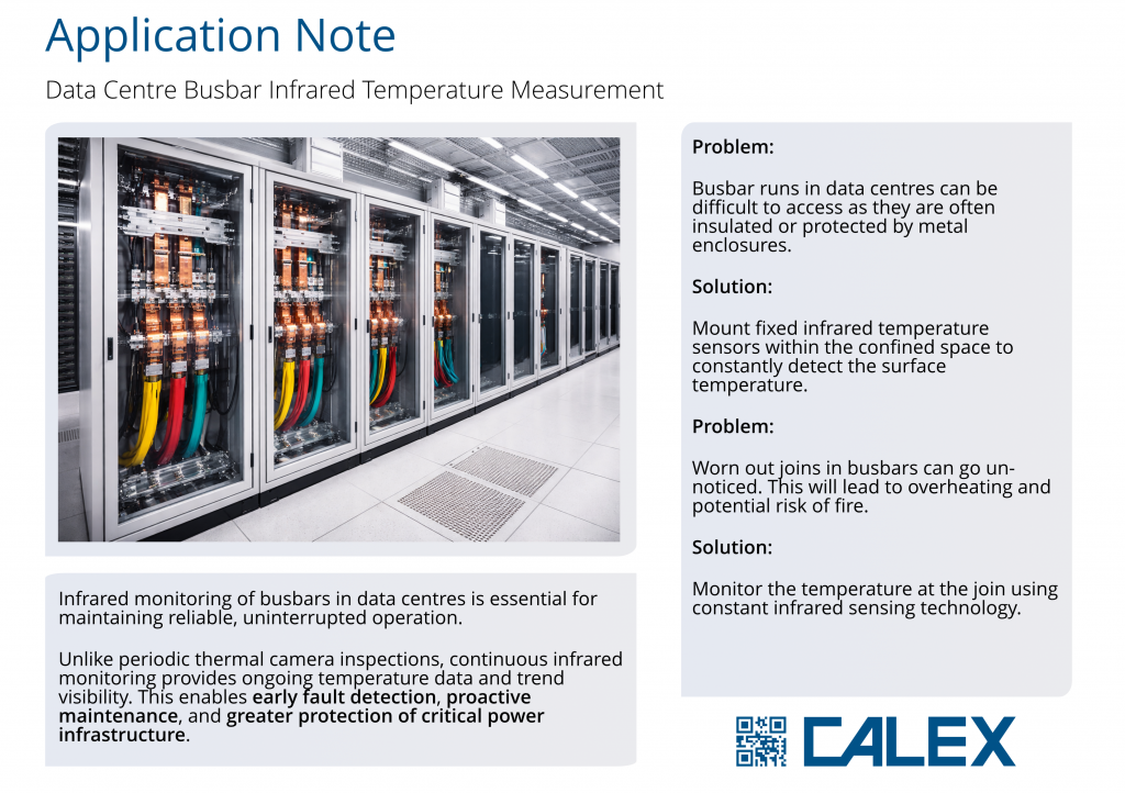 Infrared monitoring of busbars in data centres allows for continuous temperature measurement, supporting early fault detection, proactive maintenance, and improved protection of critical power infrastructure.