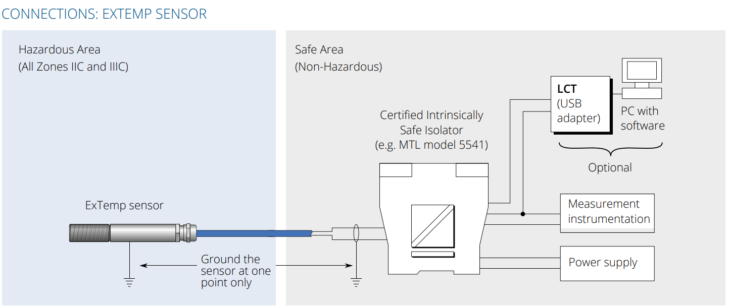 The ExTemp non-contact infra-red temperature sensor is designed to operate safely in hazardous areas, where there is a risk of explosion due to flammable vapours or dusts. It is certified “Intrinsically Safe” so there is no need for a bulky flameproof enclosure.