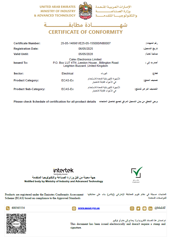 Calex is pleased to announce that the ExTemp Series of infra-red temperature sensors has recently been awarded ECAS-Ex certification, meeting the requirements for intrinsic safety in the United Arab Emirates (UAE). This certificate is valid until May 2028.