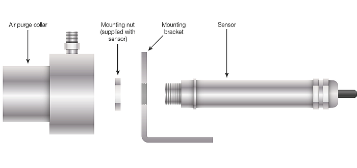 The air purge collar is screwed onto the threaded part of the sensor, after the mounting nut. This diagram shows how: