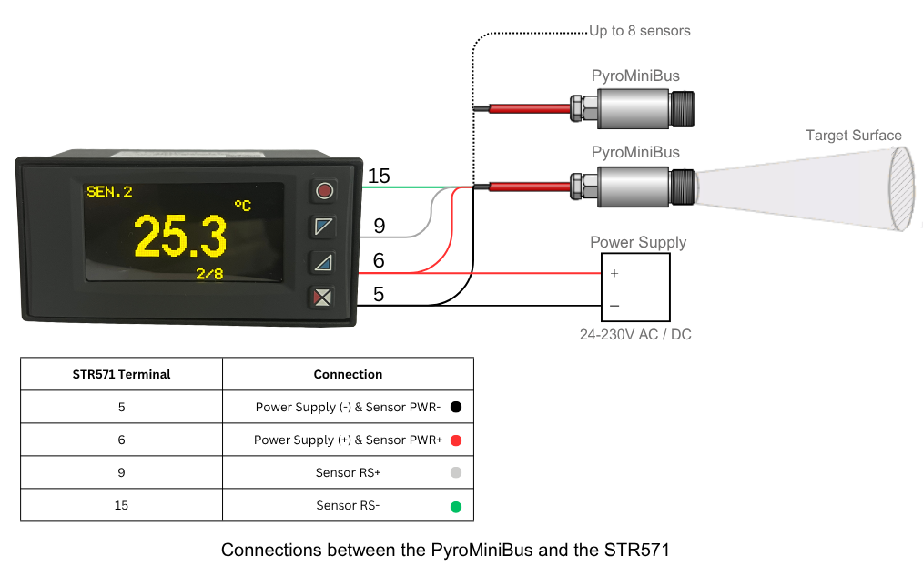 Customers looking for a low-cost system to measure up to eight surface temperatures and display the readings on a digital indicator should consider the Calex PyroMiniBus Infra-Red Temperature Sensor, supplied with a Pixsys STR571 indicator.