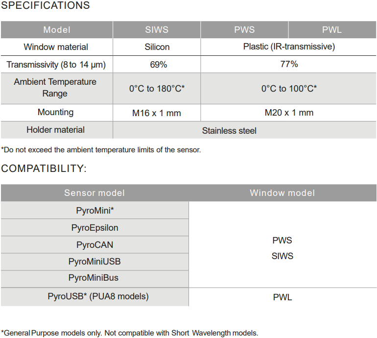 The protective window models PWS, PWL and SIWS are designed to help protect the lens of Calex infrared temperature sensors from mechanical damage, and to help