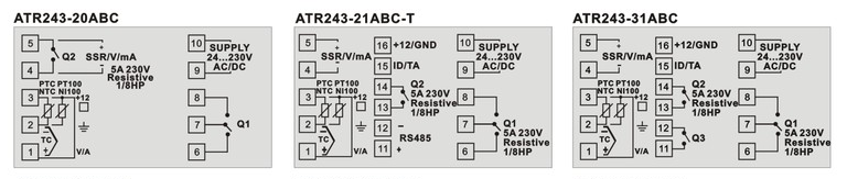 ATR243-31ABC: 3 relays 5 A resistive + 1 logic SSR 12 V 30 mA / 4 to 20 mA / 0 to 10 V for control or retransmission + Current Transformer Input 50mA for Loop Break Alarm