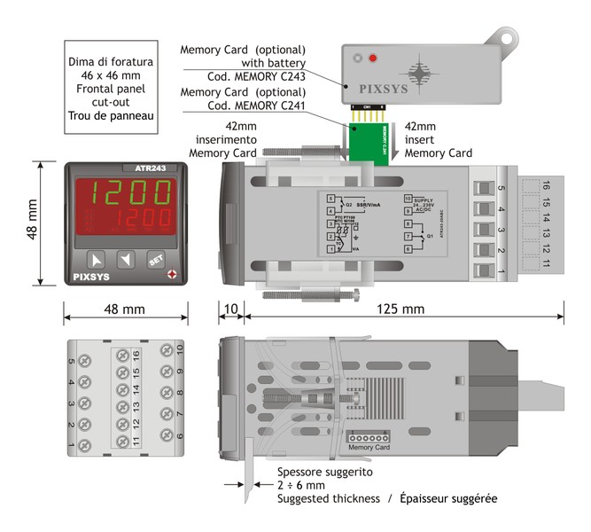 ATR243-21ABC-T: 2 relays 5 A resistive + 1 logic SSR 12 V 30 mA / 4 to 20 mA / 0 to 10 V for control or retransmission + RS485 Modbus RTU (57600 baud max) + Current Transformer Input 50 mA for Loop Break Alarm