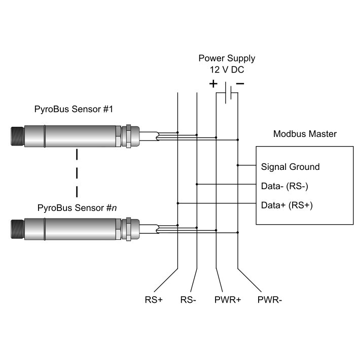 The PyroBus may be installed as a standalone network of sensors, or integrated into an existing Modbus network. Sensors may be connected in a daisy-chain via junction boxes to a single network bus cable, which can significantly simplify cable runs and reduce the cost of cabling compared to using analogue sensors.