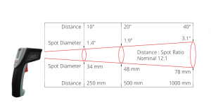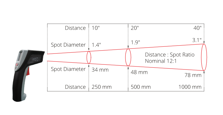 The thermometer may be used at longer distances than the above diagram shows, with a proportionally larger measured spot.