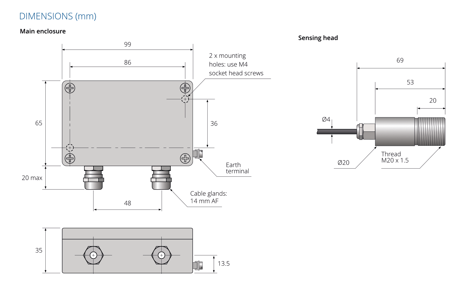 Sensing Head: Ø 20 x length 69 mm including cable gland (see Dimensions)
