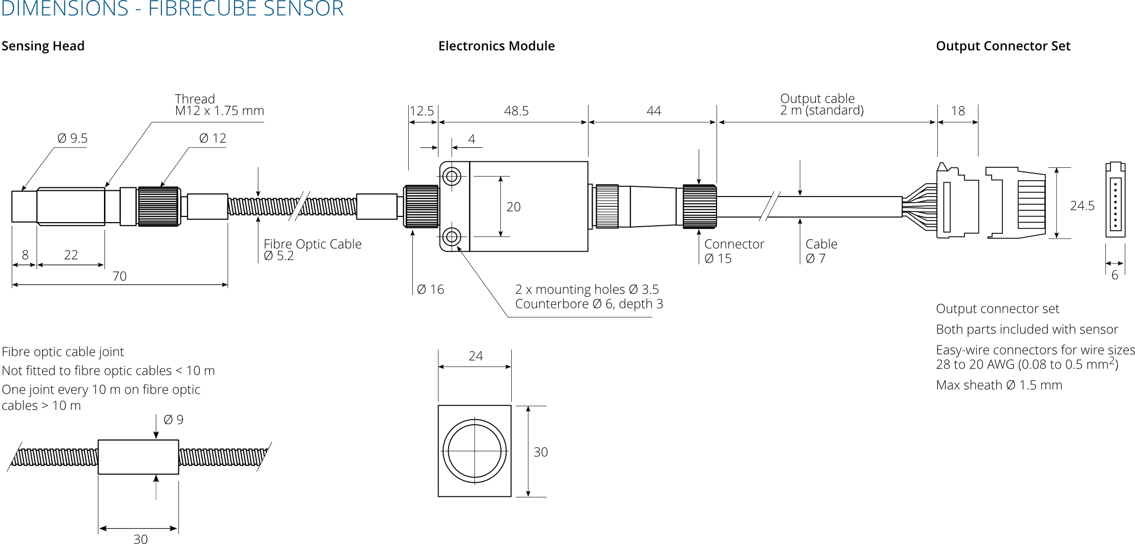 For measuring small targets at long distances, the FibreCube is the most capable of any Calex sensor, with measured spot sizes as small as 6 mm at 1 metre distance.