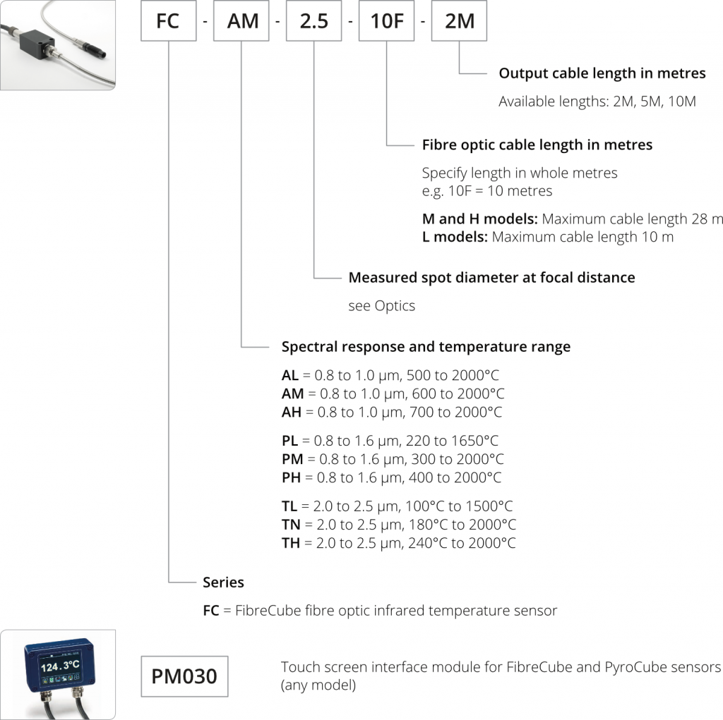 Each optics option is available for one FibreCube temperature range only (M, L, or H). For example: for FC-AM sensors, choose from the “M” optics.