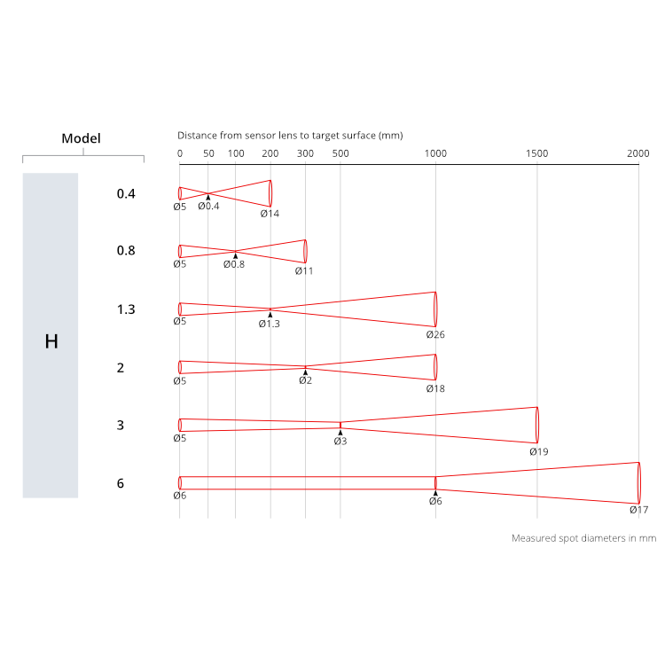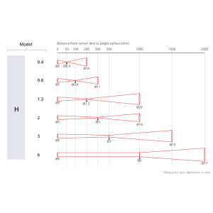 From 0.4 mm depending on measurement distance and choice of optics (see Field of View Diagrams below)