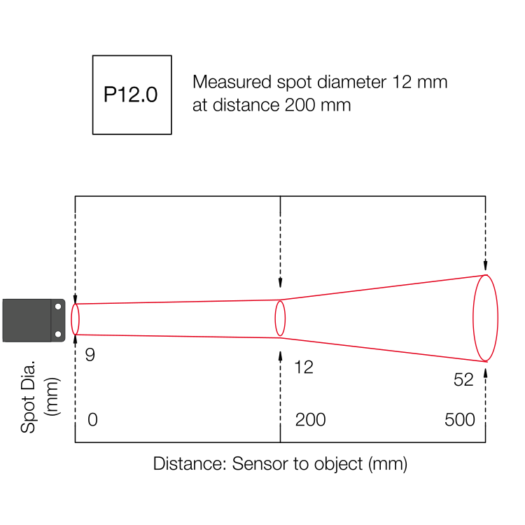 The given measured spot size contains 90% of the energy detected by the sensor. We normally recommend the target is at least twice as large as the given measured spot for maximum accuracy. Accuracy specifications are valid up to the maximum distances shown.