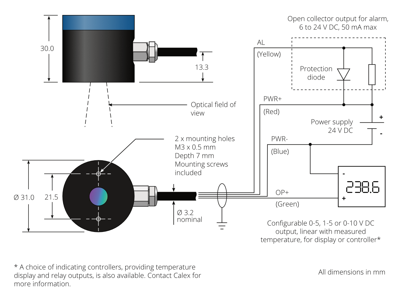 Calex can optionally fit a longer cable to the sensor (30 m max). The cable can also be extended by the user. See Ordering.