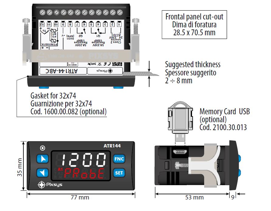 IP65 front panel with gasket, IP20 housing and terminal blocks