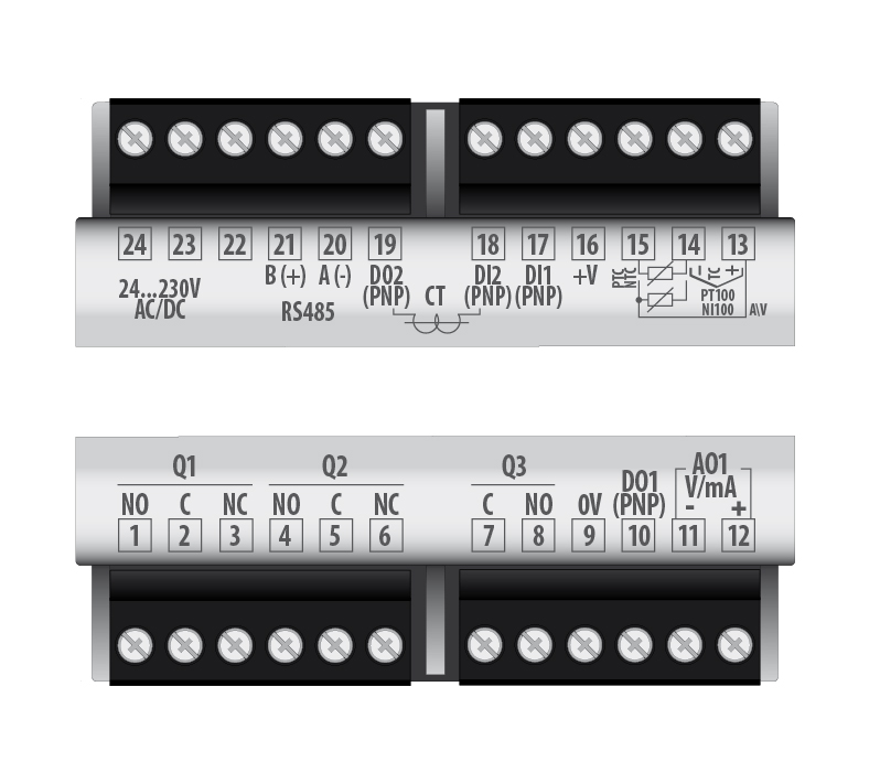 1 x analogue input + 3 x Relays + 2 x SSR + 2 x digital input + 1 x Analogue output V/mA + RS-485 + Current Transformer