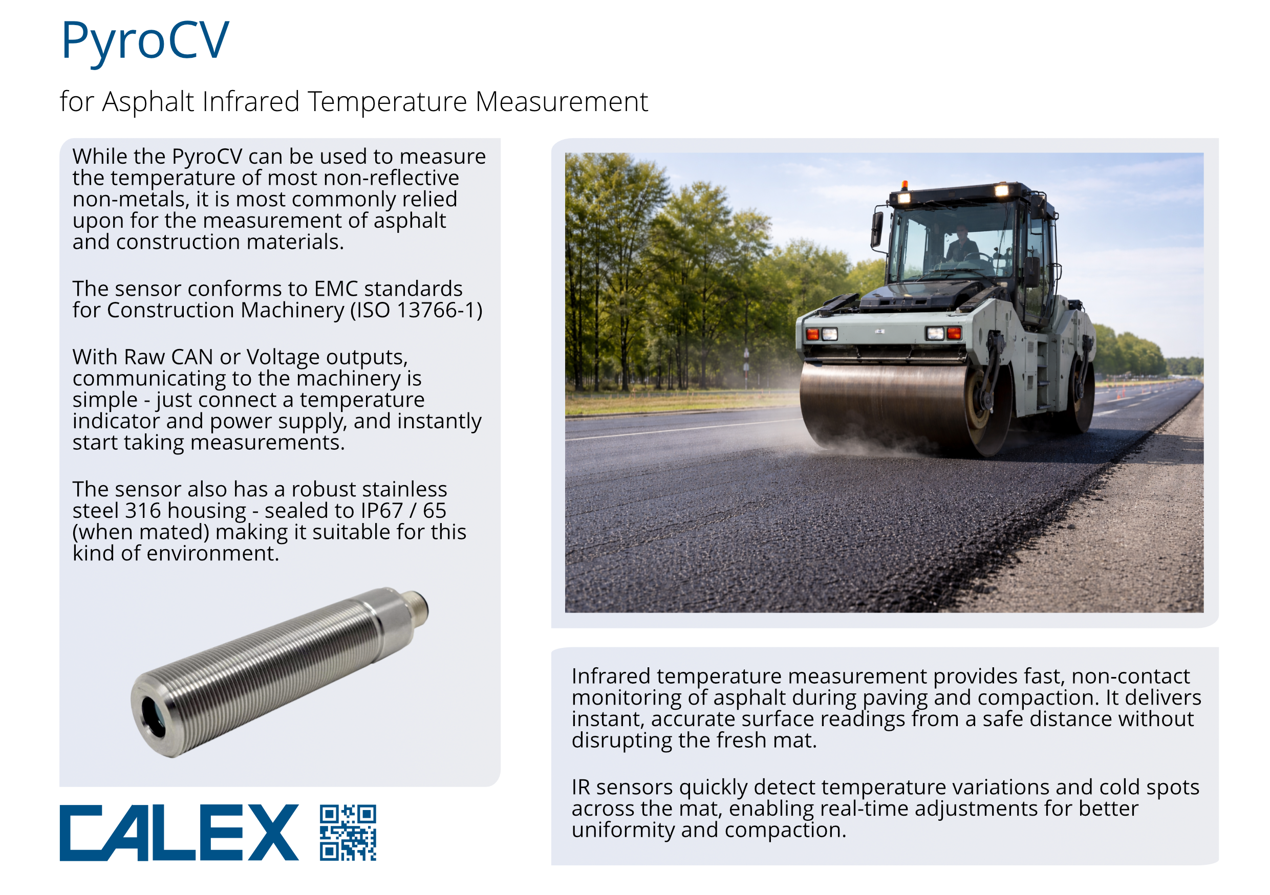 The newly released PyroCV is our suggested sensor for measuring asphalt temperature. The following application note highlights the key features of the sensor and the advantages of using infrared temperature measurement in this application.